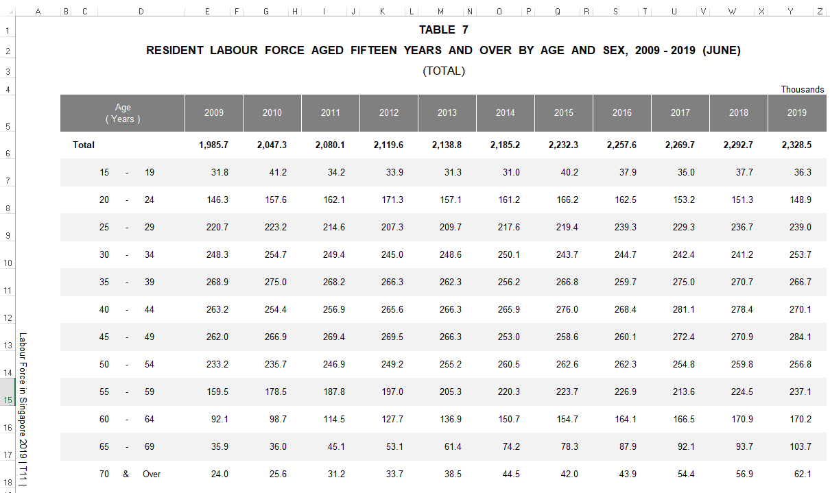 The dataset used is from Table 7 RESIDENT LABOUR FORCE AGED FIFTEEN YEARS AND OVER BY AGE AND SEX, 2009 - 2019 (JUNE), the excel sheet in Tab – T7_T. The data is available at https://stats.mom.gov.sg/Pages/Labour-Force-Tables2019.aspx.