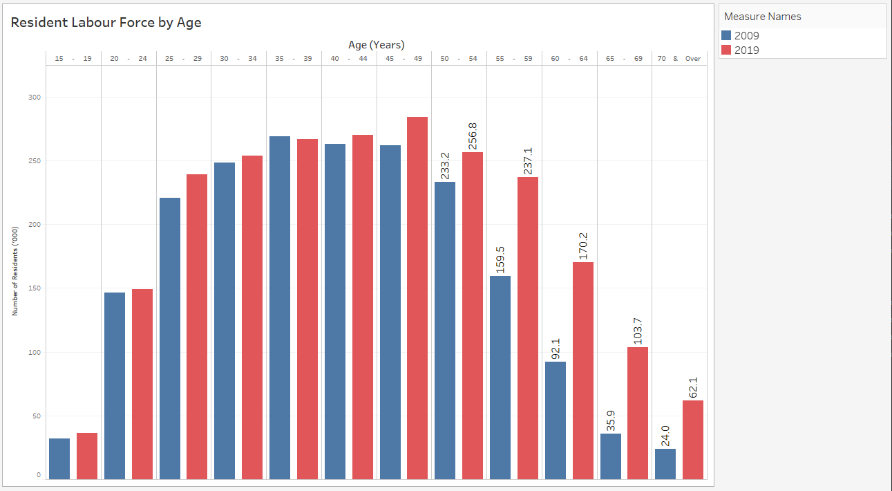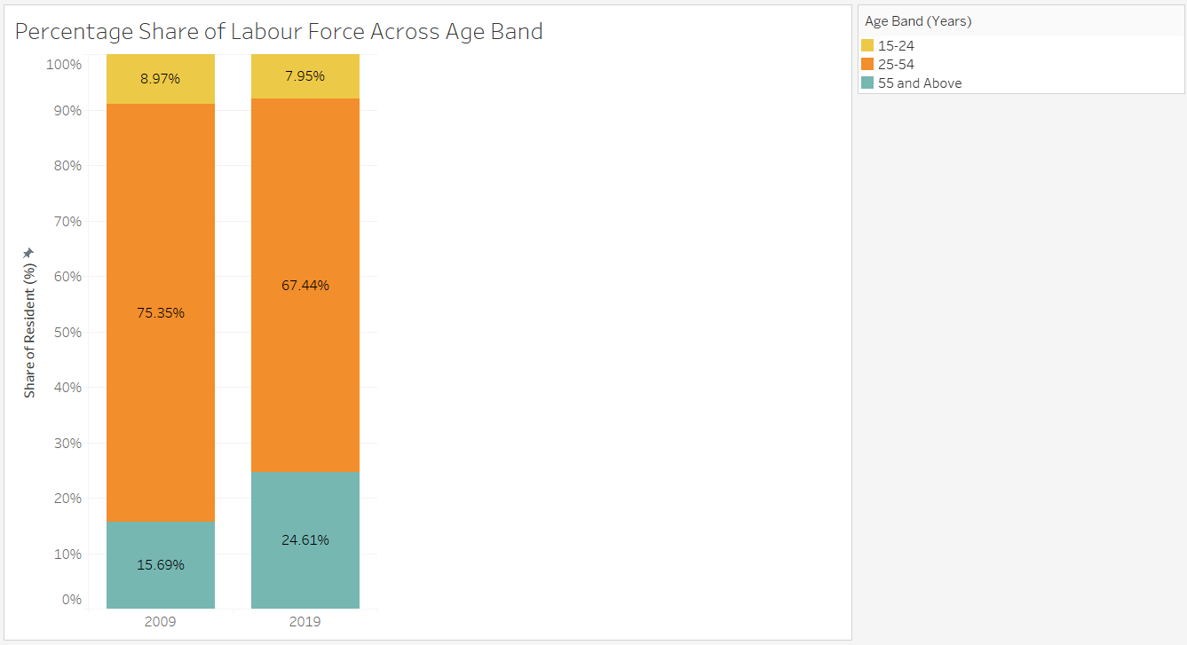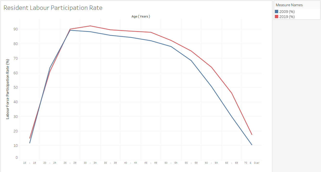 Based on Visualization 3, in 2009, residents aged 35-39 have the most number of residents in labour force whereas in 2019, residents aged 45-49. This is the same population cohort that moved across age-band after 10 years. Interesting, this cohort increases in size as well as RLPR (based on Visualization 2), suggesting either an increase in new working residents or an increase of residents re-entering workforce or both.