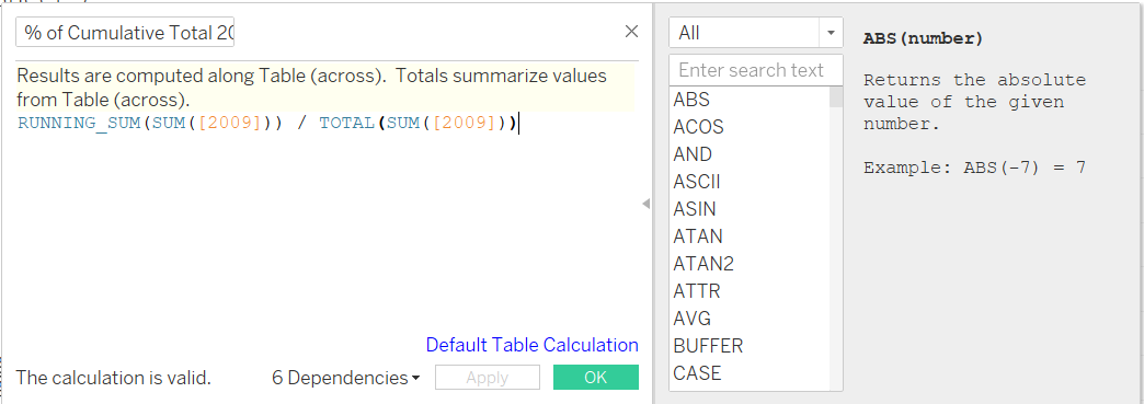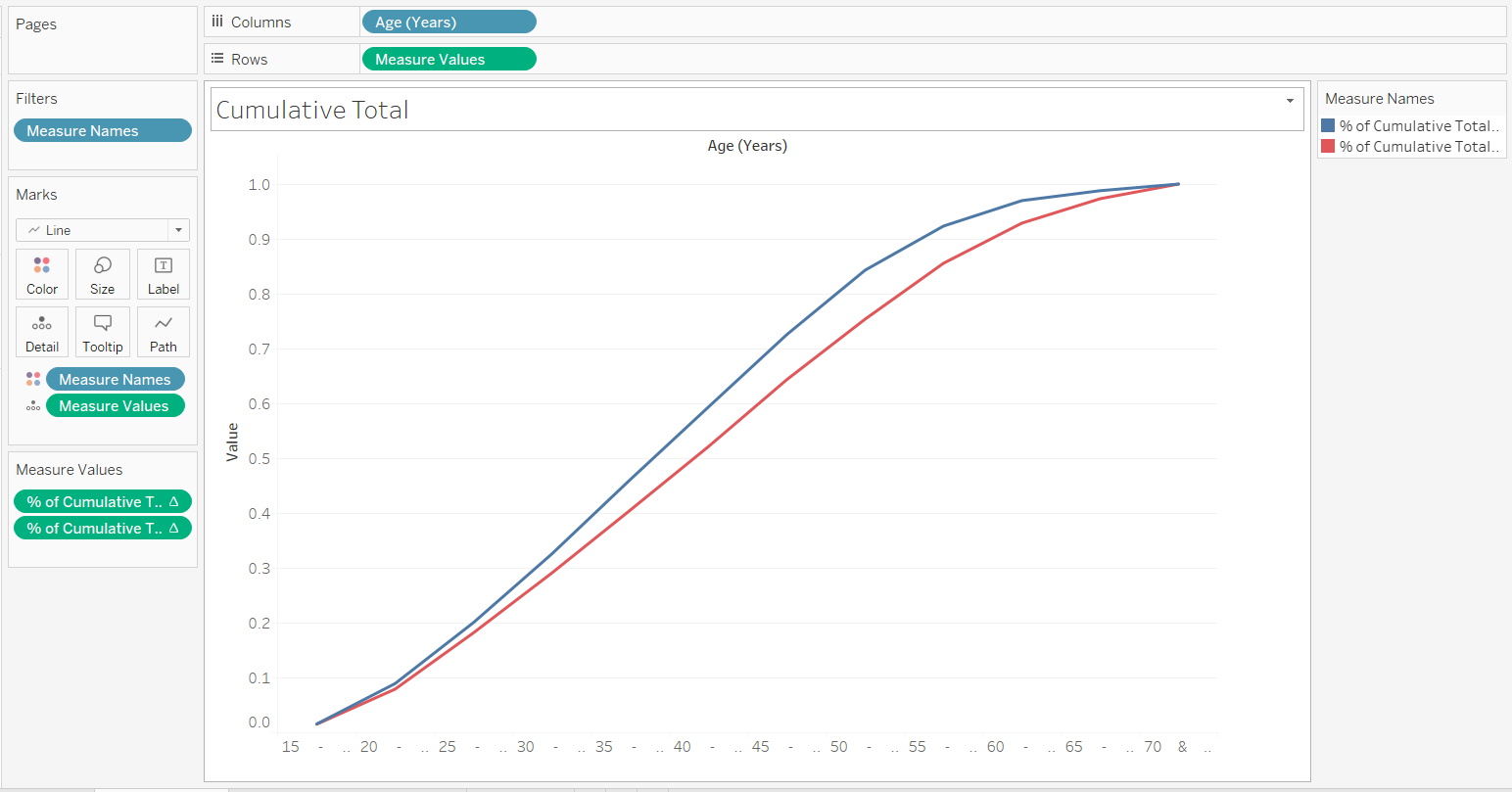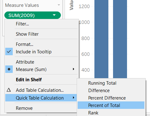 To find the cumulative total of residents in 2009 and 2019, 2 calculated fields are created using the following equation RUNNING_SUM(SUM([2009])) / TOTAL(SUM([2009]))