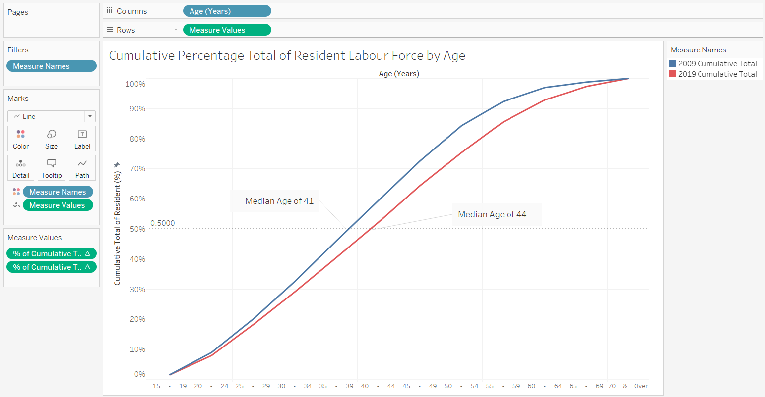 To show the median age of labour force in 2009 and 2019, a reference line at the 50 percentile is added. As the x-axis consists of age-band instead of age, annotations are included to provide more clarity