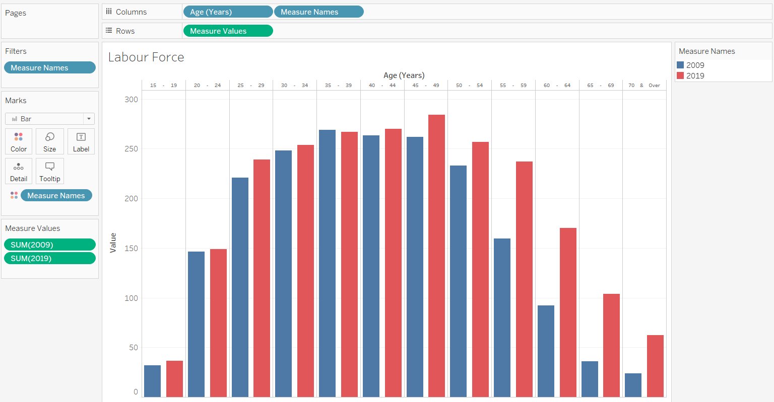 [Age (Years)] and [Measure Names] are placed at the columns whereas [Measure Values], which include summation of number of residents in 2009 and 2019 are placed in the rows. Keeping the colors consistent, 2009 is represented by blue whereas 2019 is represented by red. The marks are changed to bar for easier comparison between age bands