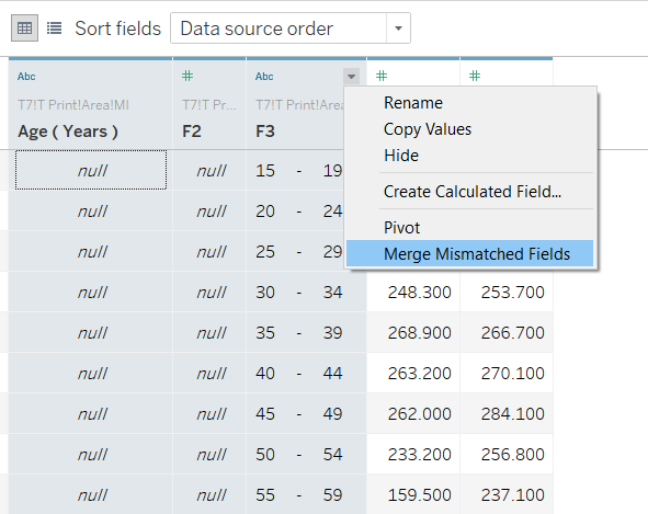 The revised datasheet is imported into Tableau for further data visualization preparation. The categorical variable – Age(Years) occupies 3 columns (A,B,C) and hence Column A and B contains null values. These 3 columns are selected and “Merge Mismatch Fields” is selected. The column is renamed to “Age (Years)”. All 3 variables and their respective data types are mapped accurately by Tableau.