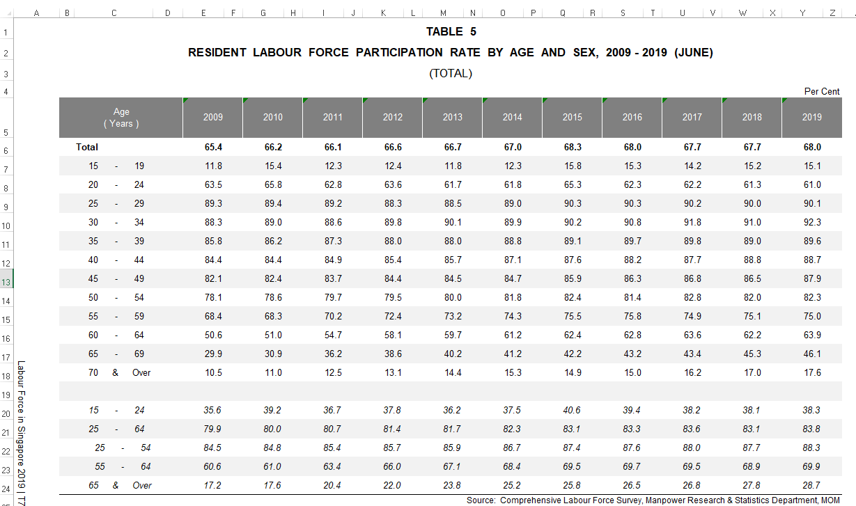 The dataset used is from Table 5 RESIDENT LABOUR FORCE PARTICIPATION RATE BY AGE AND SEX, 2009 - 2019 (JUNE), the excel sheet in Tab – T5_T. The data is available at https://stats.mom.gov.sg/Pages/Labour-Force-Tables2019.aspx.