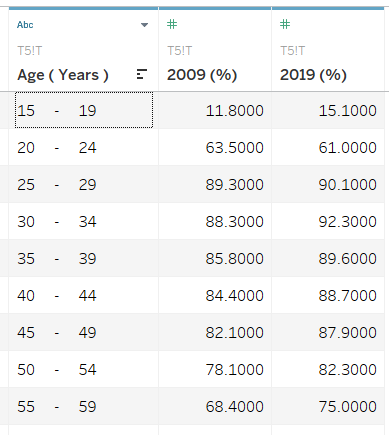 The column 2009 and 2019 are renamed to 2009 (%) and 2019 (%) All 3 variables and their respective data types are mapped accurately by Tableau.