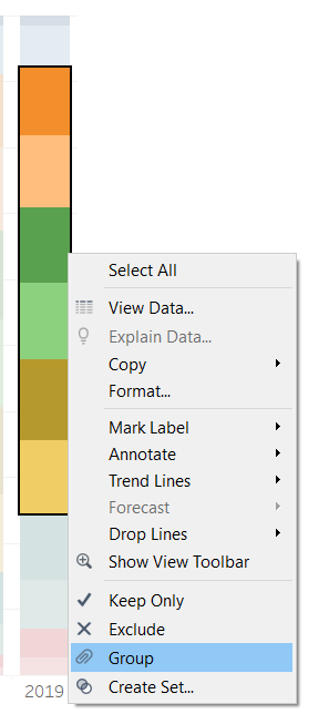 Instead of showing 12 age-bands, the age-bands will be collapsed only 3 age-bands by using the grouping function.The final age-bands are 15 to 24, 25 to 54 and 55 and above. The new dimension is re-labeled as Age Band (Years), the 3 age bands are renamed and re-colored into 3 distinct colors.