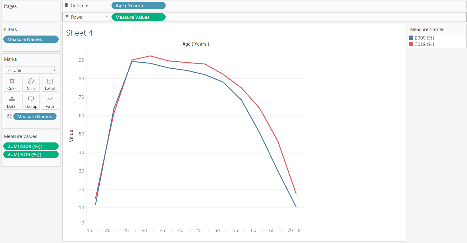 [Age (Years)] are placed at the columns whereas [Measure Values], which include summation of LFPR in 2009 and 2019 are placed in the rows. 2009 is represented by blue whereas 2019 is represented by red. The marks are changed to line graph. The visualization is given a proper header. The y-axis is also renamed as “Labour Force Participation Rate (%)”