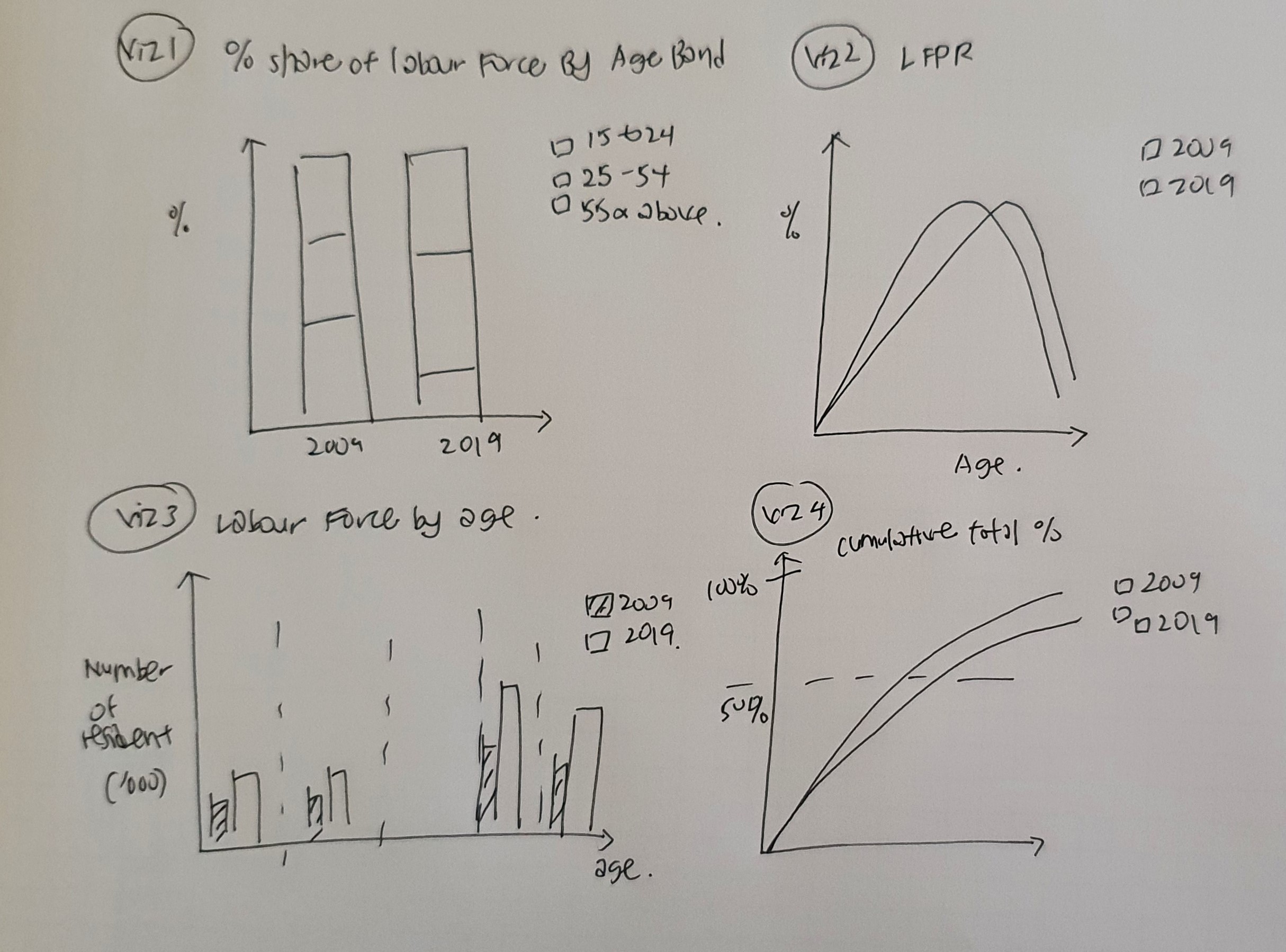 The current data visualization lacks details on LFPR as well as the absolute number of labour force for the population cohorts.Hence, the proposed design comprises 4 data visualizations, in order to provide the 4 key insights in the statement.